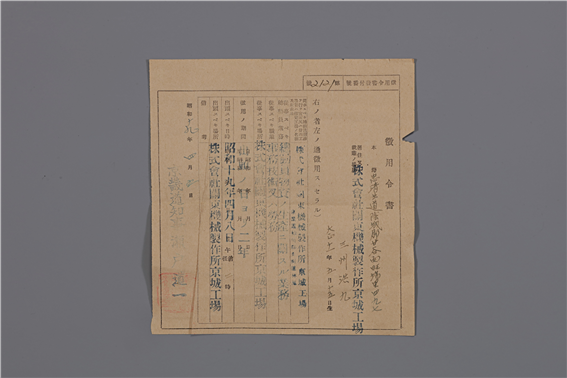 1944[昭和19]년 4월 5일 이홍구[三州洪九]를 관동關東 기계제작소 주식회사 경성京城공장으로 징용한다는 내용의 명령서. 징용령서徵用令書의 제목과 내용, 날짜, 인적사항[본적本籍, 거주 등], 취업 등을 기입할 수 있는 공란이 있음.
