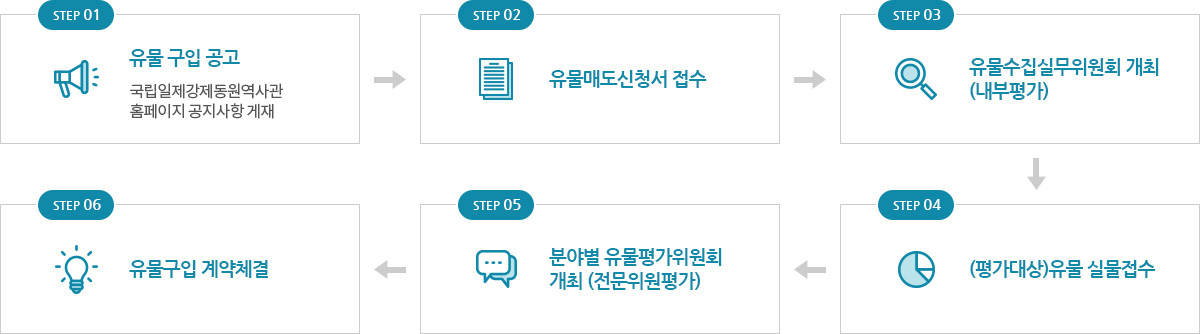 - 구입유물선정 및 가격평가 : 국립일제강제동원역사관 유물수집자체평가회 및 분야별 유물감정위원회의 심의·평가에 의함